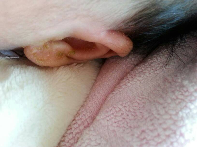 宝宝四十五天 耳朵周围后面和耳廓耳垂上都有黄色的痞怎么办 没有别的异常能吃能睡不哭闹