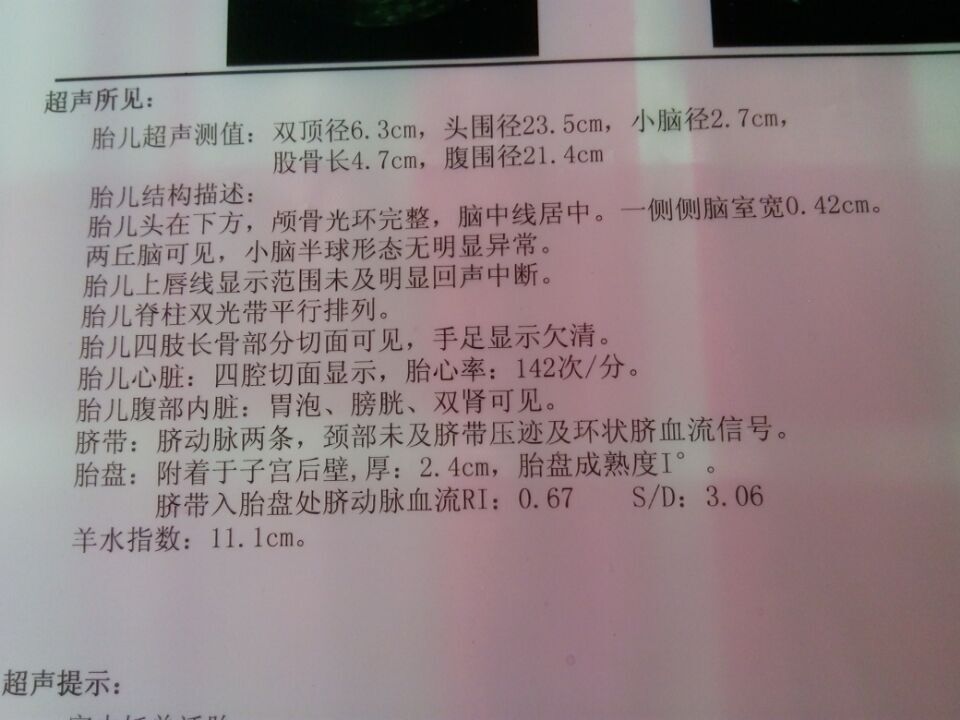 我媳妇做了个四维彩超,给的单子上也看不懂是啥意思,希望懂的老师给解释一下,看看宝宝是否正常 我媳妇做了个四维彩超,现在26周+,人家大夫说24周做最合适,结果只给做了一个图片,10分钟就完事了,给的单子上也看不懂是啥意思,希望懂的老师给解释一下,看看宝宝是否正常, 点击展开 匿名用户 2015-03-18 12:05 满意回答 胎儿正常,无畸形症状 刑曼吟_MEhC 2015-03-18 12:45 宝宝知道提示您:回答为网友贡献,仅供参考。 相关问题 希望老师们能详细解释下这张单子上各异常值有什么影响没,孩子 幼儿喜欢表现自己,希望得到老师的关注 怎么解释这句话 媳妇怀孕45天,今天有轻微流血现象,医院查了有流产先兆,还是不放心,请各位老师看看,这个是什么意思