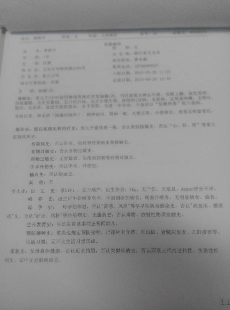 14个月大的女孩,身体一向正常,今早8点多,发生抽搐,脸色嘴唇变青紫,眼睛上翻,没有吐白沫,持续2