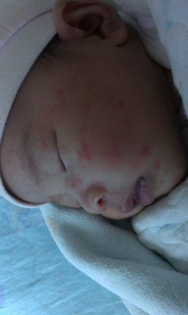 宝妈们,我的宝贝26天,最近几天长痘痘了,今天特别严重,这个怎么才能消退啊?有类似的宝妈遇到此问题