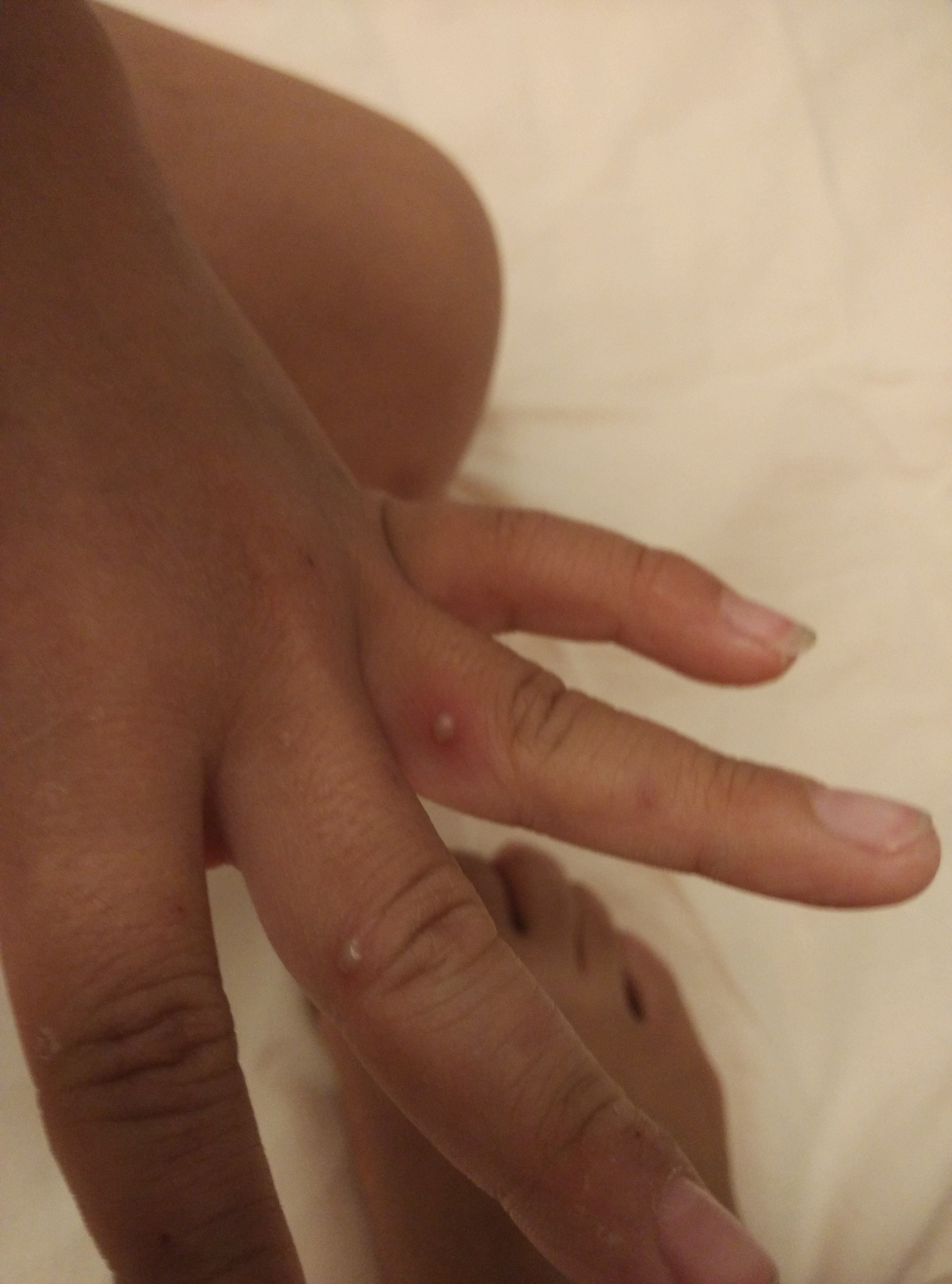 孩子六岁半,一周前开始出水痘,有疱疹,有红点,现在红点基本上都结痂了,疱疹一直没有下,刚开始疱疹里 孩子六岁半,一周前开始出水痘,有疱疹,有红点,现在红点基本上都结痂了,疱疹一直没有下,刚开始疱疹里像是水,现在像是脓,今天蹭破了一个,像一个深窝,里边都是脓。用不用输液消炎,还是让它自己愈合? 点击展开 匿名用户 2015-06-25 23:39 满意回答 明天马上去医院! 匿名用户 2015-06-25 23:40 宝宝知道提示您:回答为网友贡献,仅供参考。 为您推荐: 其他回答 那个像是虫咬的,请到医院处理。 匿名用户 2015-06-25 23:49 相关问题 水痘带状疱疹和带状疱疹是一样的吗? 宝宝前几天长了水痘,现在大部分都结痂了,可是我昨晚发现宝宝总爱摇头为什么?以前从没这种现象 出水痘会的生殖器疱疹吗?