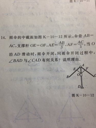 由二个三角形全等,得到角D=角B=30故有角EFC=角D+角DCF=30+20=50度二个角相等.证明:因为AE=AB/3,AF=AC/3,AB=AC,则有AE=AF,又有OE=OF,AO=AO故有三角形AEO全等于三角形AFO所以有角BAD=角CAD