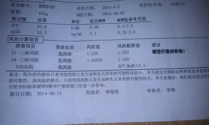 这个高风险就一定有问题吗?我要去做羊穿吗?还是重新在抽血检查一次? 这个高风险就一定有问题吗?我要去做羊穿吗?还是重新在抽血检查一次? 点击展开 情如风过 2014-06-11 20:37 为您推荐: 其他回答 呵呵我就说嘛 呵呵恭喜你的 扣451687832 2014-06-24 12:22 哟朋友说 一般一个星期内没有通知的 检查结婚正常 扣451687832 2014-06-23 22:27 别担心 大多数都是正常的 扣451687832 2014-06-23 22:22 医生说多久拿吖 我的半个月就拿了 扣451687832 2014-06-23 22:20 做了吗 多久了 扣451687832 2014-06-23 21:56 加载更多 相关问题 唐筛高风险怎么办啊,不想做羊穿,生出来宝宝会有事吗? 唉!今天去301看检查结果,预约羊穿,医生说我胎盘前位,腹壁厚,年龄又大,做羊穿容易流产,不做就怕 做羊穿就能看出胎儿是否正常吗?为什么每个医院检查的结果都不一样呢?