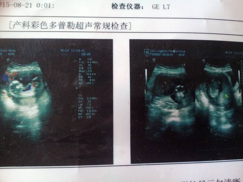 怀孕三个多月了,超声所见,胎儿可见颅骨光环,脑中线居中,双顶径约2.8cm,脊柱显示欠清晰,可见胎