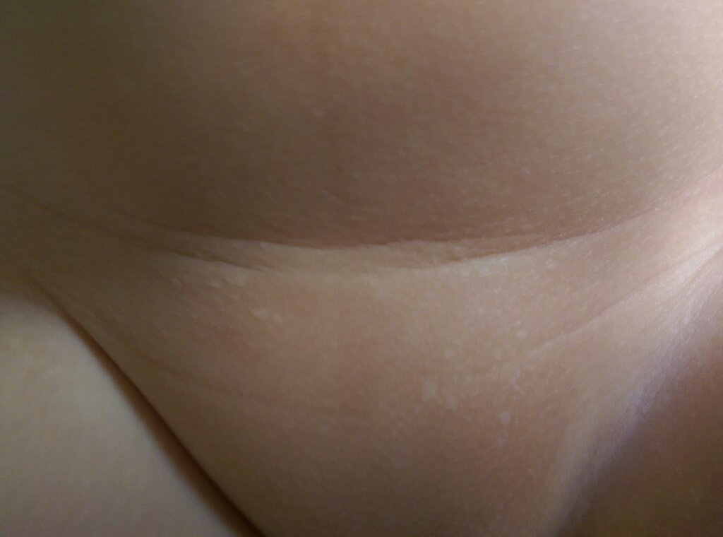 谁知道宝宝身上长的这些小白点是什么?在穿小裤衩的三角位置 以前两个,最近越来越多 平的不是瘊子 宝