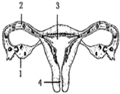 图中1是卵巢,2是输卵管,3是子宫,4是阴道. (1)卵巢是女性的主要性器官,也是女性的性腺,能够产生卵细胞和分泌雌性激素.男性睾丸产生的精子进入阴道,缓缓通过子宫,在输卵管内与卵巢产生的卵细胞相遇,精子与卵细胞结合形成受精卵.所以受精卵的形成部位在输卵管. (2)在母体的子宫内,胚胎继续进行细胞分裂和分化,形成各种组织和器官.胚胎高遮祸发育到第8周,其外貌开始像人,从这时起到出生前的胚胎,叫做胎儿.胎震荒儿生活在子宫内半透明的羊水中,通过胎盘、脐带从母体的血液里获得氧气和营养物质,同时把产生的二氧化碳等废物排到母体的血液里,再由母体排出体外.母体怀孕40周左右,胎儿就发育成熟了,成熟的胎儿从母体的阴道产出的过程称为分娩. (3)人的性别决定主要与性染色体有关.在亲代的生殖细胞形成过程中,经过减数分裂,染色体彼此分离,男性产生两种类型的精子--含22+X染色体的精子和含22+Y染色体的精子.女性则只产一种含22+X染色体的卵细胞.受精时,如果是含22+X的精子与卵子结合,就产缘串生具有44+XX的受精卵并发育成女性;如果是含22+Y的精子与卵子结合,就产生具有44+XY的受精卵并发育成为男性.所以若婴儿的性别为男性,则其体内来自父、母双方的染色体组成分别为22+Y和22+XX;从理论上讲生男生女的机会是由于男性可产生数量相等的X精子与Y精子,加之它们与卵子结合的机会相等,所以每次生男生女的概率是均等的. (4)“女大十八变,越变越好看”,与这种变化直接相关的器官是卵巢.卵巢是分泌雌激素的重要器官,而雌激素促使女性发生第二性征的改变. (5)女性结扎手术又叫输卵管结扎手术,是将输卵管的某一部分切除并予结扎,使精子与卵子不能相遇,从而达到避孕的目的.故答案为:(1)卵巢;输卵管.(2)子宫;;胎盘.(3)22+Y;;22+X;;50%.(4)卵巢.(5)输卵管.