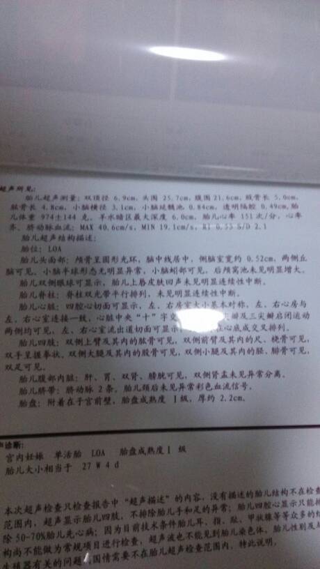 指导意见:你好,根据B超提示 胎儿27周左右,胎心率正常,没有脐绕颈,各项指标都很正常,不需要担心。建议孕期要按时产检,做好孕期保健,饮食方面要多喝水,多吃新鲜的蔬菜水果,增加营养,适量运动,忌油腻辛辣的饮食。祝您健康。
