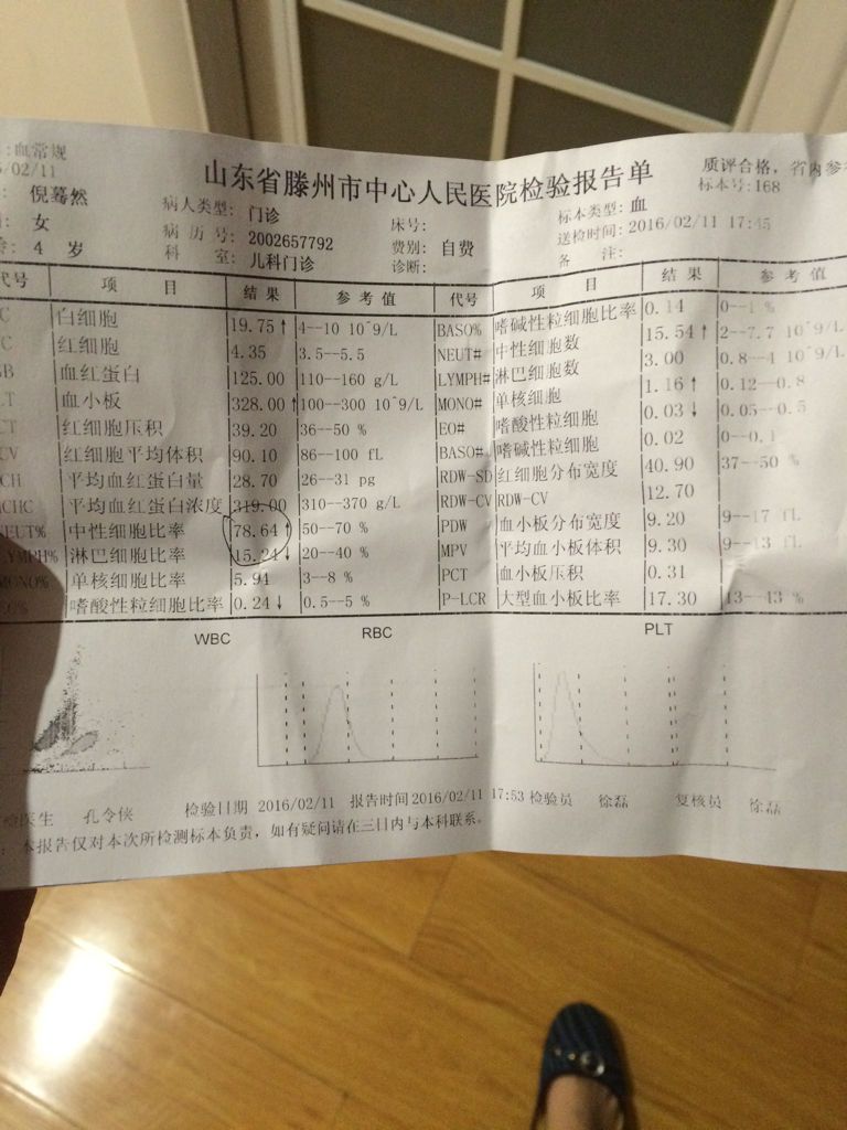 问:三岁半小孩发烧,下面是血常规图片,请问白细胞19.75,是一万多,还是19万多啊,请问用点什么