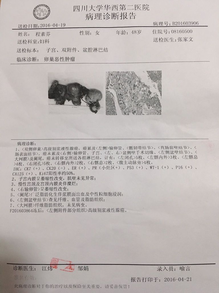 帮我分析一下一个报告,我妈卵巢癌,刚做完卵巢子宫全切手术,身体状况不是很好,应该放化疗还是保守治疗