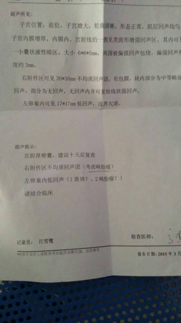 怀孕5周加5,今天去医院做阴超回来,医生说有可能是畸胎瘤,好担心,有懂的医生吗?帮我看看,谢谢了 点击展开 梦比现实美xx 2015-03-06 15:21 为您推荐: 其他回答 你好,现在不能完全确定是畸胎瘤,建议你定期复查,如果没有腹痛的现象,应该不会有太大影响。 cn#BkkkupBpfQ 2015-03-06 19:31 相关问题 我现在怀孕6周加3天,今天13号,医生让我18号做B超,而且是腹超和阴超都做,我身边的朋友都只做腹 妇科医生帮我看看这份报告里所说的左卵巢内有(小型畸胎瘤?)这可确诊吗?现在宝宝已经出生了! 今天三十一周加两天了,半晚上突然左下腹根部疼,宝宝也动得的比较厉害,持续有半个小时左右,之前做排畸检查时医生说我有畸胎瘤,还挺大的,有宝妈知道这是怎么回事吗?