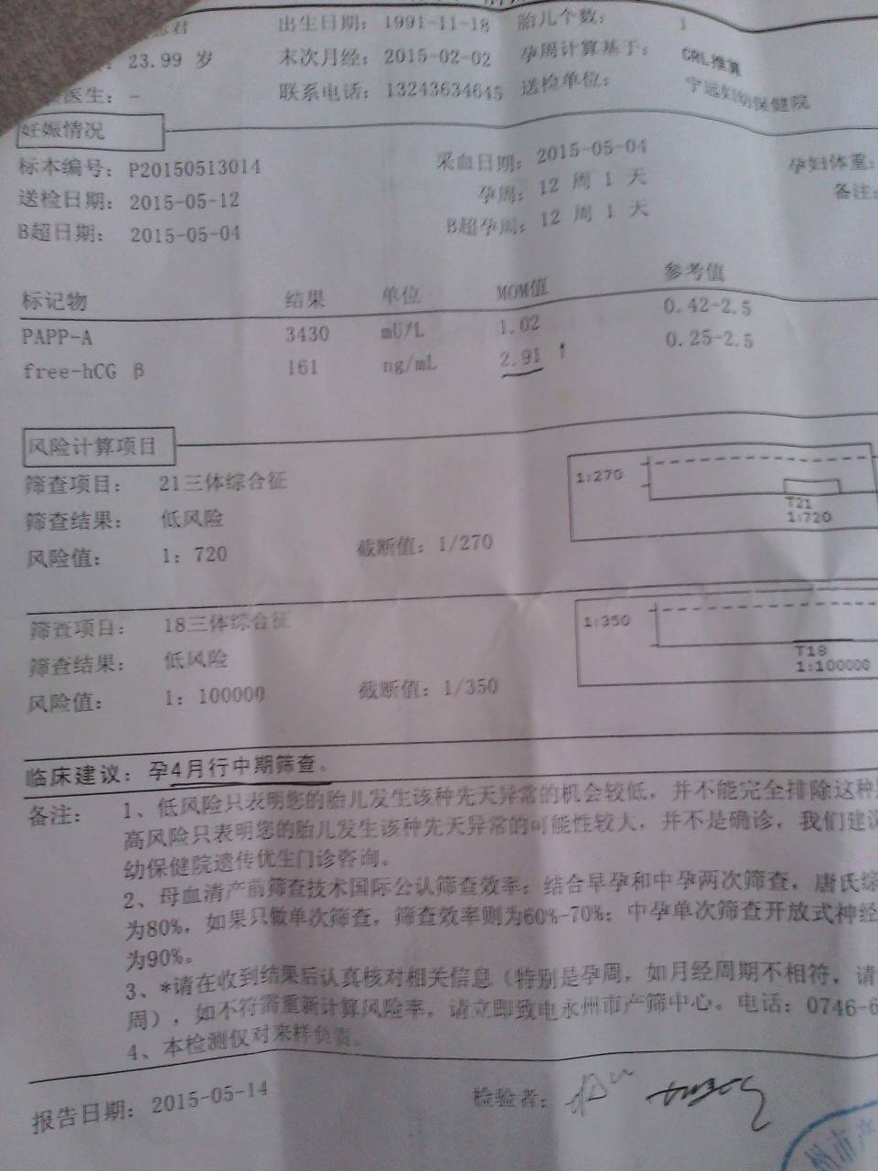 这是唐筛结果,严重吗,懂的帮我看看 点击展开 ltq 2015-06-02 18:13 满意回答 您好,你的阶震情况检查结果属于低风险,是正梨实最常的,不必担心的,祝您健康!战耻 杏林时代 2015-06-02 18:17 宝宝知道提示您:回答为网友贡献,仅供参考。 相关问题 有懂唐筛的吗?帮我看看 唐筛高风险需要做羊穿,自己了解到如果NT 值正常,可见鼻骨,问题就应该不大 但是我的b超单没有显示鼻骨问题,请专家或者懂的宝妈帮我看看胎儿是否有鼻骨!谢谢! 我想懂的朋友帮我看看,唐筛游离β-HCG正常参考值是0 26-2 49,我的检查出来是2 72,高