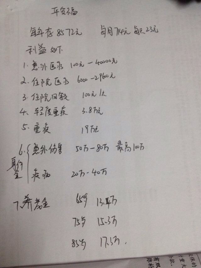 你这代理人,有点故意吧?完全手写,完全不合规矩吗。 建议找寻代理人,要求出示公司官方正规的计划书,而不是这样的手写行为,有点开玩笑了。 不知道是不专业,还是故意的》》》 1.适合的购险年龄,选择范围相减堡呈对宽泛。 2.保费的支出,应为年收入的10%—15%,保额设定为年收垃崇入的6-10倍,为宜。但应具体问题具体分析。 4.是否有社保,请关注其中得到医保和养老。 5.在社保的前提下,规划商业保险,重点放在意外和重疾上。社保和商业医疗险,不能重复报销,谨记。 6.同时关注家庭成员的保障问题,尽可能的保障好身边的人,做到家庭全面保障,否则保障失衡,保障的意义也就缺失。 7.尽可能的优先规划家庭主要收入来源者的保障问题,这很重要。 8.推荐:平安护身福分红保险、平安智胜人生万能保险,平安福终身寿险。。 9.个人建议还是和代理人之间广泛有效的交流,毕竟,面对面的交流最直接有效。必要时,也可直接拨打相关保险公司的客服电话,求证咨询。 看了你的情况,我个人推荐: 万能险,智胜人生!! 关注意外和重疾,6000元保费,30年缴费,25万-30万重疾,其余的基本先不要考虑,我们先考虑主要的需求。 个舞炼人建议,仅供参考。建议换个代理人。