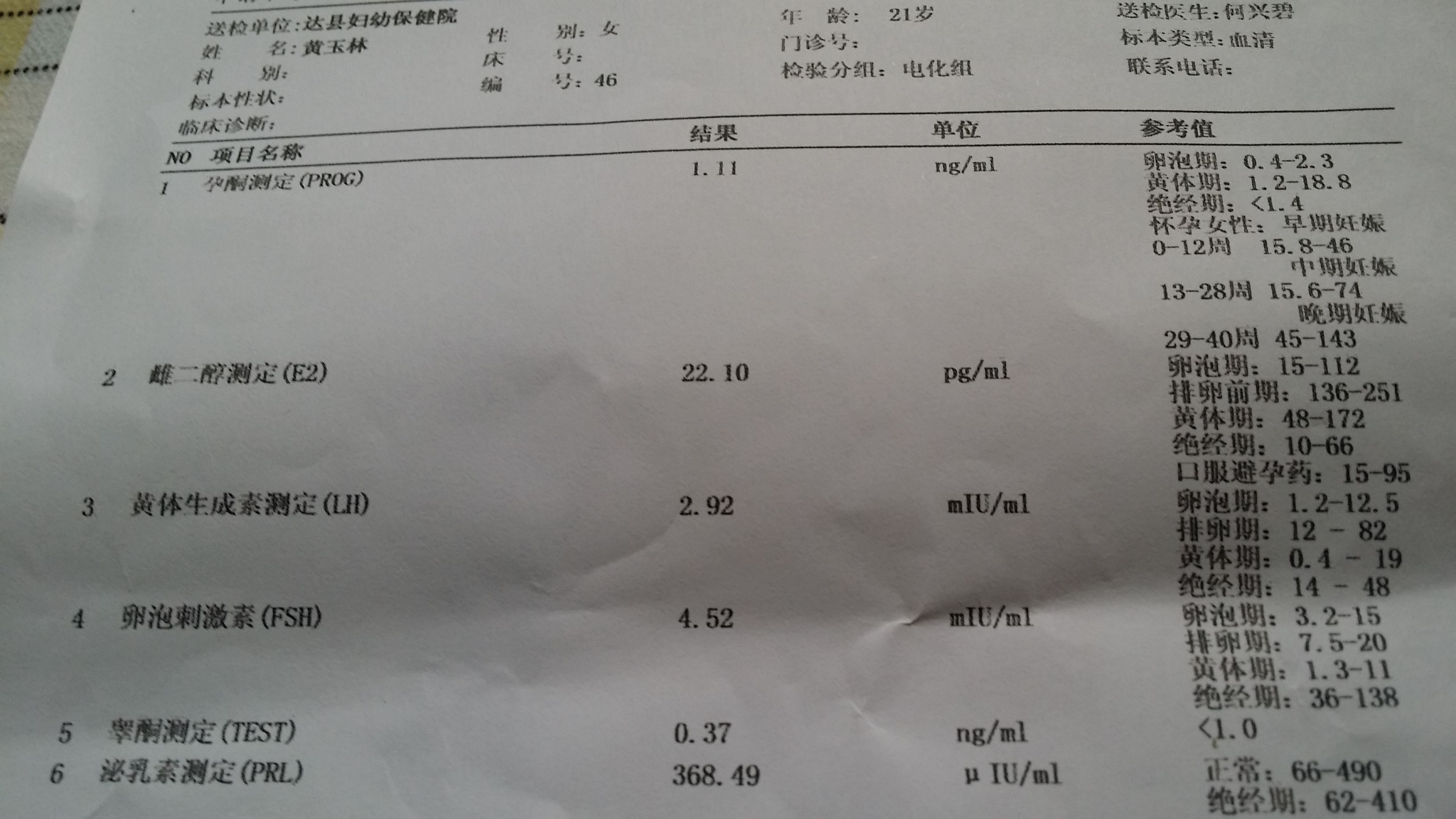 月经期第三天检查的激素六项,请各位懂的看看正常不? 点击展开 匿名用户 2014-04-16 16:43 为您推荐: 其他回答 病情分析: 你好;按你的化验结果少为有点炎症的, 指导意见: 建议你可以在临床医生的指导下治疗的,祝您健康 赫亦凝_2Vv0 2014-04-16 17:07 相关问题 在月经期第三天查的激素六项大家懂的帮我看看 看看正常不 请懂的人来帮我看看孕酮和人类绒毛膜促性腺激素的检查报告!谢谢! 月经期第三天做的激素六项检查!正常吗