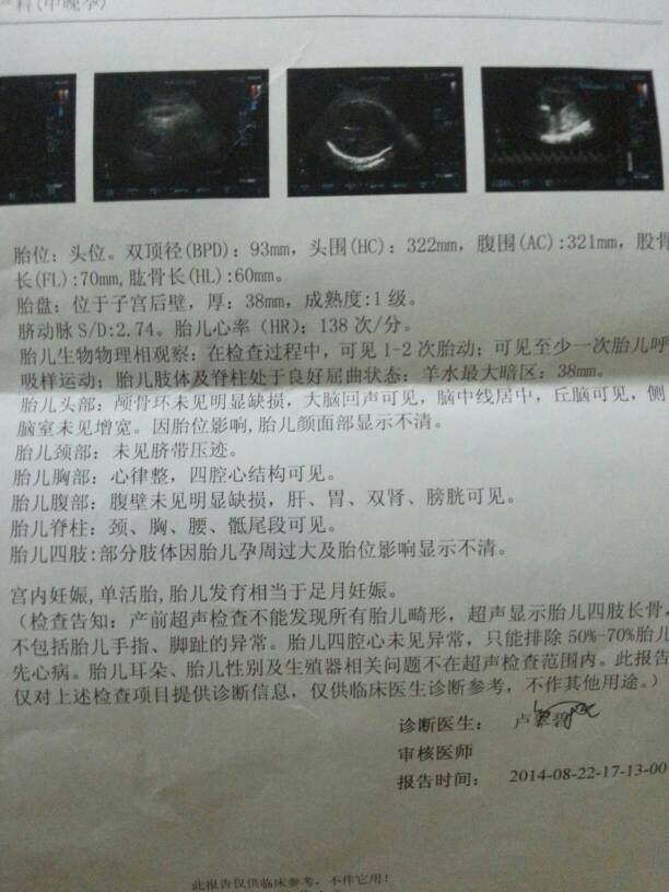 今天去照B超了,帮忙看看宝宝健康吗?现在大概多少斤了? 今天去照B超了,帮忙看看宝宝健康吗?现在大概多少斤了? 点击展开 原来心,会疼 2014-08-22 23:35 为您推荐: 其他回答 你好,你家宝宝现在就是在6.05斤呢,这样的宝宝就是很正常的,宝妈最好就是不要担心的 黄宇医生 2014-08-23 23:47 大概六斤多。 ╰つSay丶No 2014-08-23 23:19 大概六斤噢宝妈。 倩小妞~ 2014-08-22 23:46 应该不小的,我那时双顶径93,我家宝宝8斤多 无语_0QiW 2014-08-22 23:41 相关问题 有医生吗能帮忙看看宝宝有几斤了吗?下面是B超单 我从怀孕到现在5个月了,去做过三次B超,但从来没去做过产检,这样有问题吗,怕宝宝不健康吗? 前几天量血压 55/90 怀孕到现在 才102斤 特别担心宝宝的健康 我
