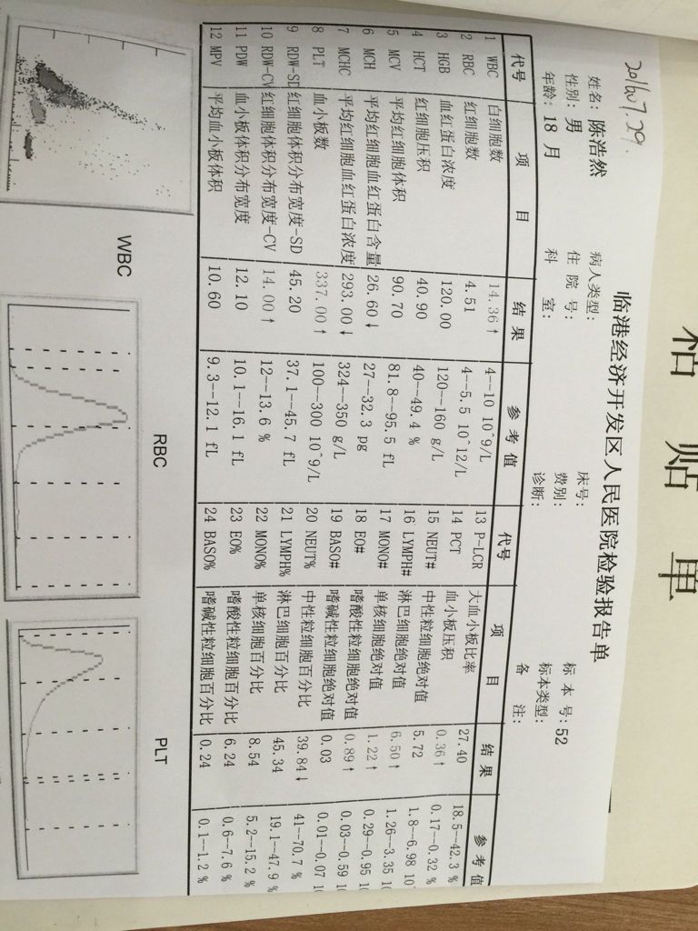 帮忙看看1岁半的宝宝的血常规化验单 点击展开 匿名用户 2016-07-29 16:37 满意回答 有点细菌感染,可以吃点消炎药 cn#BGVLVufkGL 2016-07-29 16:38 宝宝知道提示您:回答为网友贡献,仅供参考。 相关问题 帮忙看看宝宝的血常规化验单好吗 7个月的男宝宝反反复复发烧!最高38 5度!麻烦大夫帮忙看看血常规化验单 麻烦妇科方面的医生帮忙看看这个血常规化验单,我妈有子宫肌瘤