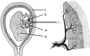 如图是胎儿发育期间营养供应得相关结构图,据图回答下列问题.(1)请标出B和C的名称:[B]-[C]