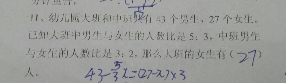 幼儿园大班和中班共有43个男生,27个女生,已知大班中男生与女生的人数比是5比3,中班男生与女生的 幼儿园大班和中班共有43个男生,27个女生,已知大班中男生与女生的人数比是5比3,中班男生与女生的人数比是3比2,求大班的女生人数是多少 点击展开 匿名用户 2014-11-03 21:43 满意回答 54 匿名用户 2014-11-03 21:43 宝宝知道提示您:回答为网友贡献,仅供参考。 为您推荐: 其他回答 女生人数是54 匿名用户 2014-11-03 21:51 相关问题 幼儿园大班和中班共有32个男生,已知大班中男生和女生人数为5:3中班中男生女生人2:1求大班女生人数 幼儿园男生每人发8张画片,女生每人发6张画片,男生人数是女生的8分之7,女生比男生少发16张画片 幼儿园大班和中班共有45个男生,25个女生已知,大班中男生与女生的人数比是5:3,中班男生与女生