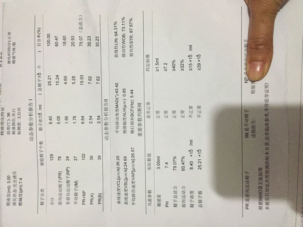 亲们,这是备孕半年没坏上做检查的结果,有懂的帮忙解释下(图一是女的,图二是男的),谢谢! 点击展开 匿名用户 2016-06-07 19:20 满意回答 你好,根据你所描述密以的情况精子的活动力大值在正常范围以内。支原体的阳性需要进一步服用消炎药洞狗物以糟糕夕后再次复查。 cn#BappauBQff 2016-06-07 19:27 宝宝知道提示您:回答为网友贡献,仅供参考。 相关问题 宝宝三岁,视力检查如图 看太懂,谁帮忙解释一下 各位懂医学的宝宝们,看看我这个是怎么了,平时该注意啥,我拍张图给你们看看,帮忙解释下,刚刚体检的单 我女朋友这月9号月经结束,昨天我们做过,女朋友直问我会不会怀孕,这个我也不知道,懂的解释一下,谢谢