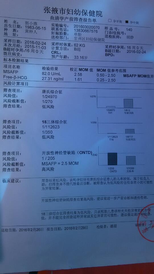 唐筛的准确率不高的,建议你做无创DNA或者羊水穿刺。无创DNA抽取的是孕妇的静脉血,无风险,准确率高达99%,羊水穿刺虽然风险不大但还是有风险的。希望我的回答对你有帮助。
