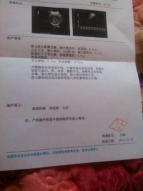 帮我看看彩超单子 今天32周拍的 宝宝有几斤 怎么算?? 帮我看看彩超单子。今天32周拍的。宝宝有几斤。怎么算?? 点击展开 呵呵😊😄 2014-11-19 15:12 为您推荐: 其他回答 这算不准不过我看的6斤多到7斤那块 寂寞时的爱 2014-11-19 15:40 :胎儿体重(千克)=双顶径(厘米)X0.9-5.2您的宝宝的体重可以自己计算下的 laojianghu309 2014-11-19 15:13 相关问题 请帮我看看孕30周+2天的彩超单子 彩超单子显示宝宝体重1787g+/-400g是多少斤 四维彩超的单子和唐氏综合症的单子帮我看看宝宝的情况