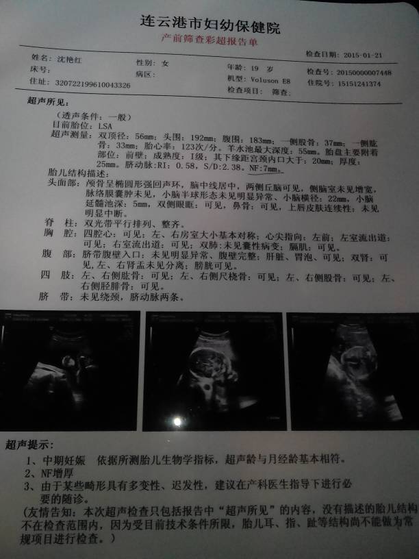 五个半月做的三维彩超,NF7毫米,三个半月建卡时,抽血做的唐筛,NTD高风险,这次三维医生建议做羊