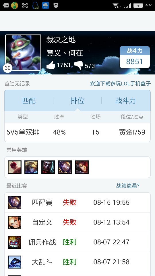 lol求开黑小伙伴,别看我段位只有黄金,其实实力意识有钻石 (毕竟五个月没打排位了,从铂金掉下来了 lol求开黑小伙伴,别看我段位只有黄金,其实实力意识有钻石。(毕竟五个月没打排位了,从铂金掉下来了)。。不求技术有多叼,欢乐就好。输赢不重要,开心就好→_→ 点击展开 匿名用户 2015-08-17 13:57 推荐回答 我就喜欢输赢不重要的人,你是哪区 的, 匿名用户 2015-08-17 14:00 宝宝知道提示您:回答为网友贡献,仅供参考。 为您推荐: 其他回答 楼下的可以一起玩啊 匿名用户 2015-08-17 14:21 你的心态不错。 匿名用户 2015-08-17 14:02 你这样的人我见的多了 匿名用户 2015-08-17 13:58 相关问题 孕妇可以逛珠宝店吗?黄金,铂金,和钻石会对宝宝有辐射吗? 打算买个铂金钻石戒指,不知道怎样?铂金很软吗? 怀孕可以带钻石…铂金吗?