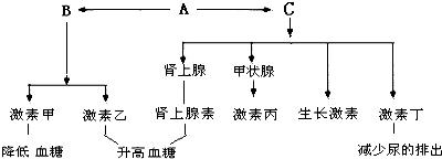 (1)激素甲具有降血糖的作用,人体内降血糖的激素只有胰岛素,激素乙具有升高血糖的作用,激素乙是胰高血糖素,胰岛素和胰高血糖素之间具有拮抗作用. (2)当体内甲状腺激素达到一定浓度后,会反馈给下丘脑和垂体,从而抑制两者的活动,这样系统就可以维持在相对稳定水平,这就是所谓反馈调节. (3)激素丁是抗利尿激素,作用于肾小管和集合管,促进肾小管和集合布吊管对水的重吸收,减少尿的排出. (4)水盐平衡的调节中枢在下丘脑,渴觉得形成是在大惑叹躬脑皮层,形成过程是:细胞外液渗透压升高→(下丘脑)渗透压感受器→传入神经→大脑渴觉中枢(大脑皮层)→产生渴觉.故答案为:(1)胰岛素;; 胰高血糖素;; 拮抗训司(拮抗作用/拮抗关系)(2)甲状腺激素;;反馈调节;(3)重吸收;;;(4)A;;;;下丘脑细胞外液渗透压升高→(下丘脑)渗透压感受器→传入神经→大脑渴觉中枢(大脑皮层)→产生渴觉