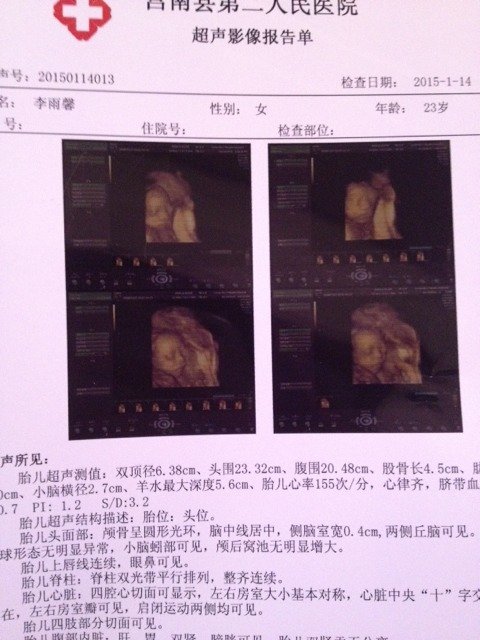 我家宝贝四维 我家宝贝四维 点击展开 孟家媳妇👄 2015-01-17 13:30 为您推荐: 其他回答 呵呵,四维都差不多。 思凡Baby 2015-01-17 20:04 你好,看检查报告胎儿的大小大概是在孕期 的26周左右的,羊水及胎心正常。建议按时产检, 文斯6 2015-01-17 16:51 呵呵,好孕 周 杰伦 2015-01-17 15:08 应该是男孩吧,生的时候报个喜,看看我说的对不对 萌小宝… 2015-01-17 14:21 真漂亮。。 漫雪叮馨 2015-01-17 14:16 加载更多 相关问题 看看我们家宝贝的四维 看到那么多四维照的宝贝,今天我也来炫一下…漂亮的女宝 怀孕多久才能做四维想看看宝贝发育情况