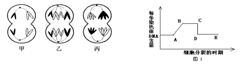 下图中的甲、乙、丙是来自某哺乳动物同一个体3个正在进行分裂的细胞示意图,图1是该动物细胞分裂过程中DNA的含量变化。以下叙述中正确的是 [ ] A.丙图中,DNA分子:染色体:染色单体=1:1:2 B.甲、乙对应于图1的DE段,丙对应于图1的BC段 C.甲是次级精母细胞或极体,乙是初级精母细胞 D.丙图的细胞中没有同源染色体,乙图的子细胞中有2对同源染色体
