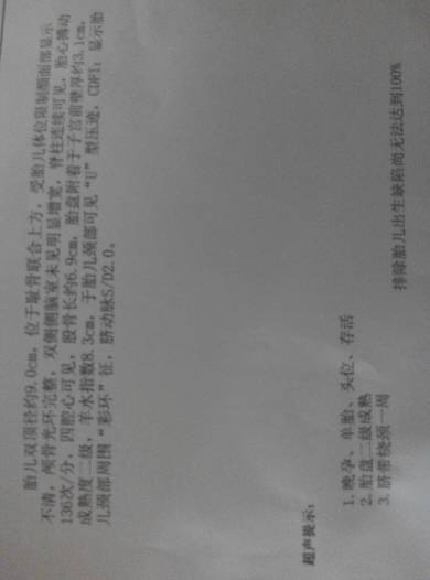 39周了…这个彩超数据什么意思 39周了…这个彩超数据什么意思 点击展开 ok闲庭坐看浮云 2014-09-01 14:14 为您推荐: 其他回答 你好,看你提供的这个BC数据,胎儿大小相当于孕36周,脐带绕颈一周,其他情况是没有问题的,不需要担心 一直在路上yw 2014-09-01 14:37 相关问题 怀孕39周,彩超数据如下,顺还是剖? 彩超显示怀孕29周+s/d 2 0是什么意思 彩超显示29周 + s/d 2 0是什么意思