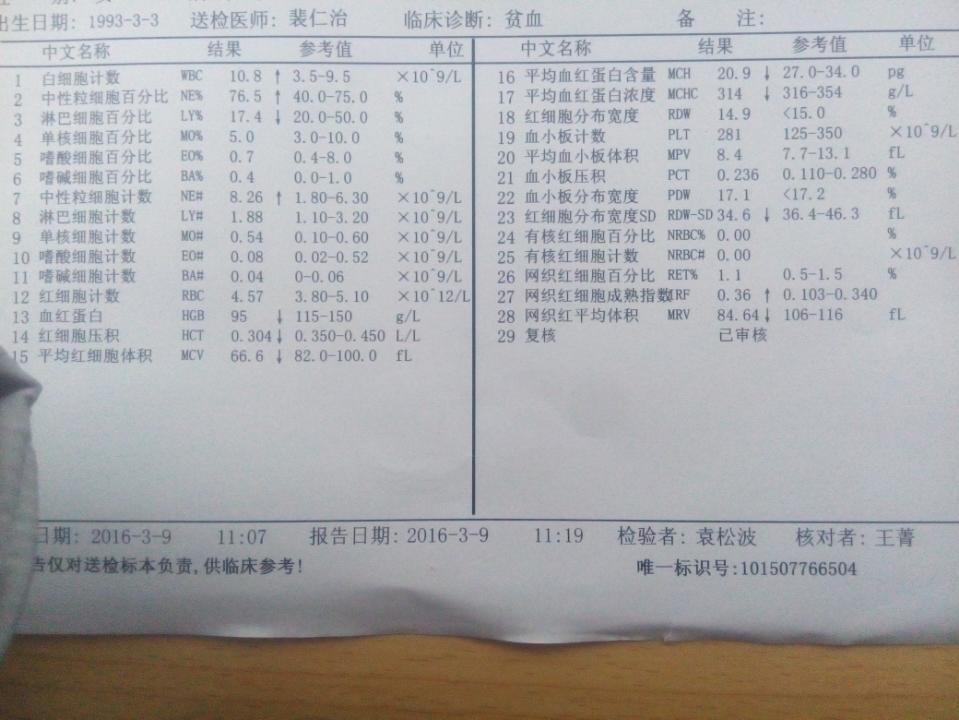 现在已经怀孕六个月 一直找不到贫血的原因 这个今天验血网织红细胞计数和血常规的报告单 哪位医生能给 现在已经怀孕六个月 一直找不到贫血的原因 这个今天验血网织红细胞计数和血常规的报告单 哪位医生能给我解答下。非常感谢! 点击展开 137*****415_Et1x 2016-03-09 12:58 为您推荐: 其他回答 让医生开点贫血的药吃 丫头伊诺 2016-03-09 15:00 问问医生。 jiahao 2016-03-09 14:59 多休息。。。 佳慧妈妈! 2016-03-09 14:57 我也是贫血,医生给开药了,平时饮食多注意 韩小陌 2016-03-09 14:57 祝您好孕, 小猴子.. 2016-03-09 14:36 加载更多 相关问题 孕妇血常规有几项偏低,医生说可能有地中海贫血,需要验血才知道!我想没那么严重就不用了,行吗?看下我 我家宝宝五月份生病疱疹性咽炎的血常规报告单,当时发烧39 3!医生能帮我看下宝宝有没有贫血? 怀孕18周,感冒第四天,昨天去做了血常规检查,医生说是有点细菌感冒,他也没开药,我想问我应该怎么做