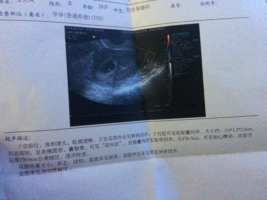 子宫前位,体积增大,轮廓清晰 子宫实质内未见肿块回声 子宫腔可见娠囊回声,大约:2.0*1.2*2 子宫前位,体积增大,轮廓清晰。子宫实质内未见肿块回声。子宫腔可见娠囊回声,大约:2.0*1.2*2.2Cm,形态规则,呈类椭圆形,囊壁厚,可见"双环征",妊娠囊内可见胎芽回声,长约0.3cm,可见胎心搏动。宫腔另见厚约0.9cm分离区,透声较差。 双侧卵巢大小、形态、结构、血流未见异常。双附件区未见明显异常回声,医生说有流血,流产前兆。但B超没有说有血呢。查血结果要明天出来,好担心。 点击展开 AD028338692969 2016-03-12 18:54 为您推荐: 其他回答 放松心情, 翠微寒烟 2016-03-12 20:13 问问医生吧 悦大小姐 2016-03-12 19:14 没事,没事的,宝妈别怕 『馨悦』宝贝 2016-03-12 19:03 祝你好运, 137*****700_x3zF 2016-03-12 19:03 别担心了一切都会好好的 甜心宝宝2016 2016-03-12 19:03 加载更多 相关问题 子宫后位,体积增大,轮廓清晰,子宫实质内未见肿块回声 子宫腔可见妊娠囊回声,大小约3 2*1 2* 宫外孕保守治疗之后6月1号住院,当时查HCG1150,8号出院,HCG151,子宫前位,形态大小正常,实质回声尚均 膀胱充盈可,子宫前位,体积增大轮廓清晰,子宫实质内未见明显肿块回声、宫腔中上段可见壬辰囊回声,大小