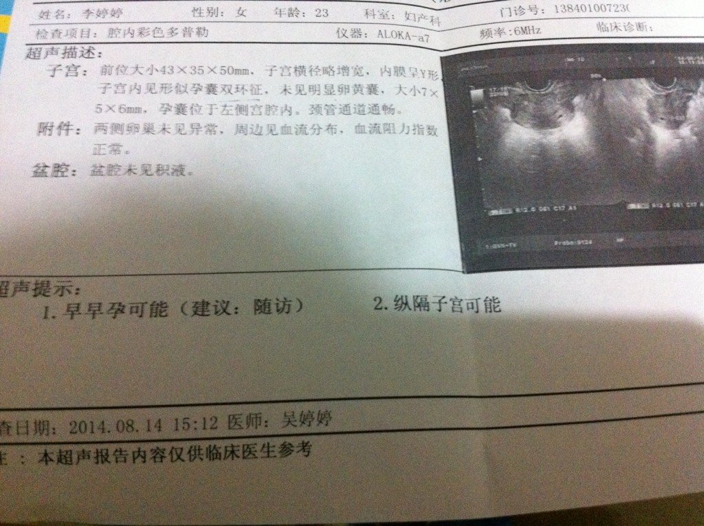 姐姐们,我这问题严重吗,一个礼拜前没有查出孕囊,今天查出来,医生又说纵隔子宫,我又要担心一个礼拜 姐姐们,我这问题严重吗,一个礼拜前没有查出孕囊,今天查出来,医生又说纵隔子宫,我又要担心一个礼拜 点击展开 小妮子婷7 2014-08-14 19:39 为您推荐: 其他回答 别担心,有时候他们查的也不准,可以换家医院再试试 杰杰liu 2014-08-14 22:26 放松不要紧张 滴滴 2014-08-14 22:03 保持心情,祝你好运 ber 2014-08-14 21:21 相关问题 我是先天性完全纵隔子宫,后来做了微创型手术,医生给了3个月的药(补佳乐和安宫黄体酮)现在第四个月去 不完全纵隔子宫术后吃药,医生给了头孢拉定胶囊,补佳乐和孕酮片 他好像说先吃头孢(1天3个)和补佳乐 请问医生,一胎不完全纵隔子宫刨腹产,二胎有影响吗?