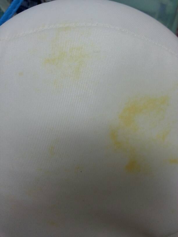 熊孩子,用热水烫一下,在用牙膏抹上,洗衣液洗衣粉搓一搓,放在盆子里泡着,差不多了就拿出来搓,两支手大拇指摩擦那样搓