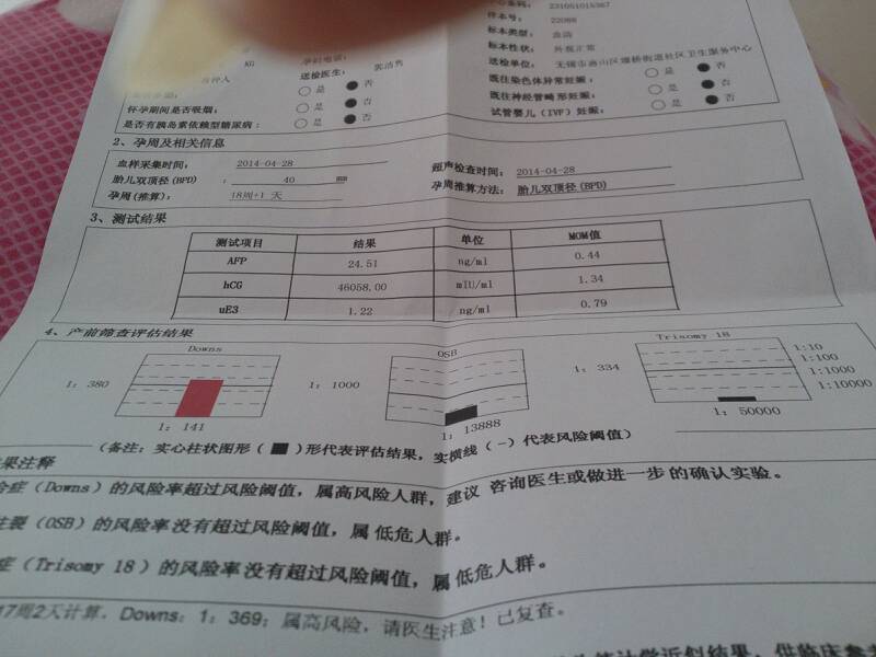 请问产前筛查评估结果是这项是…downs****…1比369是高风险想请问一下 点击展开 匿名用户 2014-05-05 09:39 为您推荐: 其他回答 病情分析: 根据你的情况,在怀孕的15-20周行唐氏筛选检查, 指导意见: 20-28周行四维彩超进行检查,确定胎儿的情况。另外现在加强营养,在怀孕13-27周补充钙剂促进胎儿发育。 纵寻桃_OzTg 2014-05-05 10:18 相关问题 唐筛产前筛查评估结果downs1:64是不是高好多,,听医生说的好吓人 唐氏筛查结果单上显示 测出来的值都在标准范围内…可为什么下面又有个产前评估 一共三项有两项高风险 医生说低风险 我就搞不懂产前评估是什么情况 我的产前筛查评估结果第一个downs显示有点高,正常值是1/370我的是1/380我该怎么办?