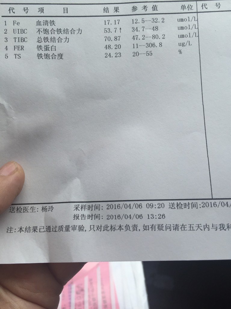 不饱合血铁结合力53.7这个正常吗? 不饱合血铁结合力53.7这个正常吗? 点击展开 钱娇娇。 2016-04-07 17:34 为您推荐: 其他回答 正常,,, 随意0910 2016-04-07 17:50 不清楚,, 花落【】陌离 2016-04-07 17:48 不太清楚、 龙2015 2016-04-07 17:46 不懂呢!! 151*****317_b4c3 2016-04-07 17:46 问问医生吧 155*****899_RC9P 2016-04-07 17:46 加载更多 相关问题 不饱合血铁结合力70 87是什么意思 我们宝宝检查出来,血好像是11 2,标准是12,是不是需要补铁啊 血之缘孕妇一天补多少铁