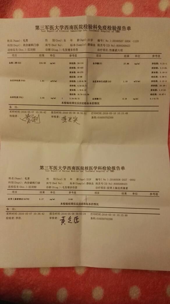 最近发现自己的汗毛再长,前几天去医院检查激素六项结果有些不正常,现在发现自己怀孕了怎么办,还要去内 最近发现自己的汗毛再长,前几天去医院检查激素六项结果有些不正常,现在发现自己怀孕了怎么办,还要去内分泌科看病吗?会不会遗传给小孩呀 点击展开 匿名用户 2016-05-15 09:00 推荐回答 泌乳素偏低脂搂医意义不大,你目前不是阶耀多囊卵巢综合症,怀孕继续,定期再复满怪查。 植向秋_nXYc 2016-05-15 09:23 宝宝知道提示您:回答为网友贡献,仅供参考。 相关问题 别人都说怀孕长汗毛是因为肚子里是个男胎所以雄性激素旺盛引起的,是真的吗? 生过一个宝宝,后来怀孕人流掉了,再后来怀孕见红去检查医生说是死胎 现在准备怀孕需要去医院做一下检查 现在怀孕三个月要去医院做什么检查?要到什么?