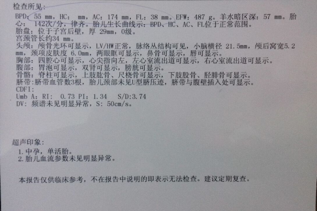 24周三维彩超的数据,BPD:55mm,AC:174mm,FL:38mm,EFW:487g,羊水暗区深:57mm.胎心:142次/分
