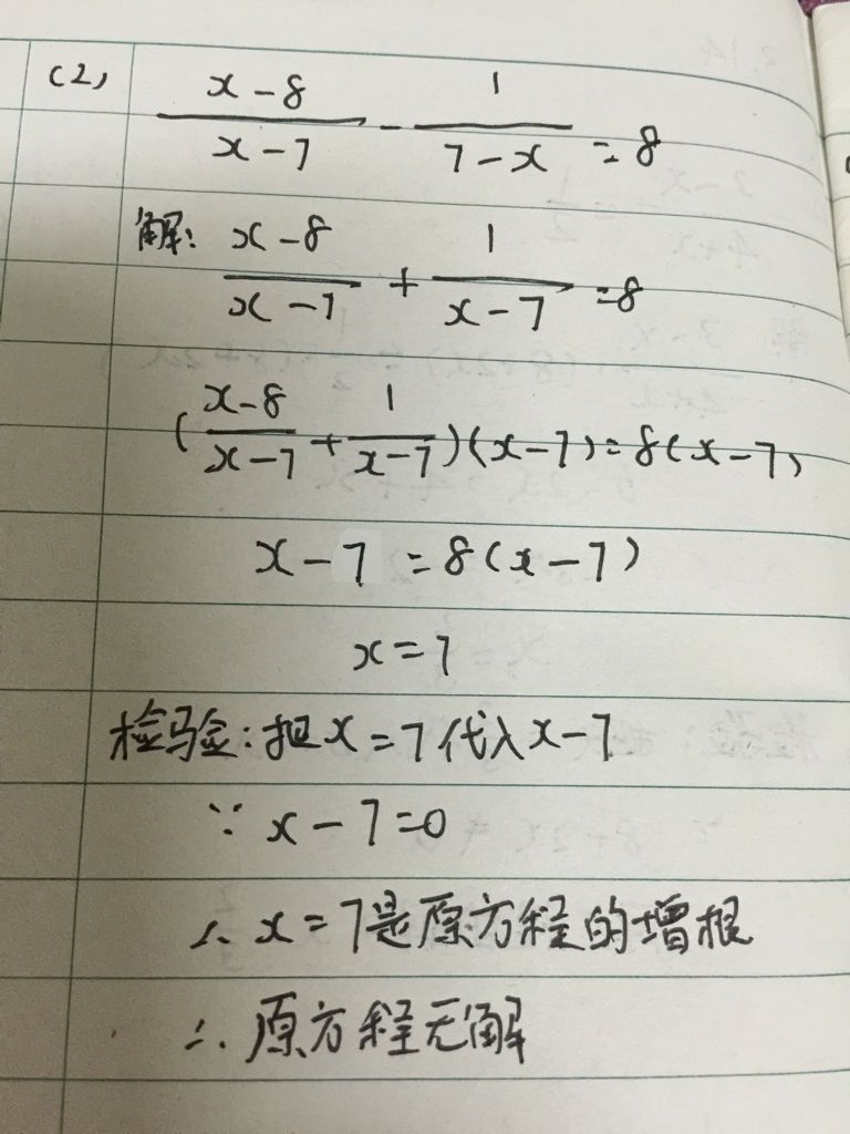 意思是将最后得出的X值代入原式中检验 情况 1.分母不为零,则X的值就是方程的解 情况 2.分母为零,X的值就是增根,方程无解 本题属于情况2,所以有如此结果