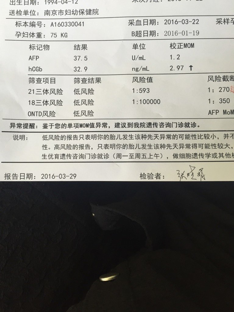 唐筛hCGb风险高有事吗 唐筛hCGb风险高有事吗 点击展开 Fy 2016-04-01 11:31 为您推荐: 其他回答 咨询医生一般要做羊膜穿刺 小静AD 2016-04-01 11:43 做个无创或者羊穿进一步检查 宝浠 2016-04-01 11:41 问医生。。 婷儿~ 2016-04-01 11:40 。。。。。。 酸心 2016-04-01 11:40 要做无创。 怡淳妈妈 2016-04-01 11:39 加载更多 相关问题 我年龄28周岁,唐筛时18周+4 唐筛21三体风险值1:313,临界风险是1:270 hcgb指标有点超,合理最高是2 5,我是3 6 用不用做无创? 唐筛风险三低 但是其中hCGb mom0 47; u 唐筛结果高危,急急急!!!今天拿到唐筛的结果顿时把我吓傻了,我今年26岁,20周,报告结果为:hcgb:4 07标准值为(0 3—2 5)21三体综合征风险值: