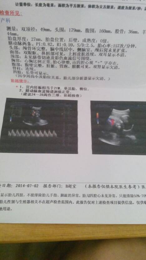 医生帮我看看胎儿发育怎么样,七月四号做的b超 医生帮我看看胎儿发育怎么样,七月四号做的b超 点击展开 小生命的诞生 2014-07-13 12:32 为您推荐: 其他回答 你好。其实我觉得这个时候你为什么不能够让你的医生看呢?你每次做B超都是想让你的医生看的,我真的搞不懂你们竟然相信一个陌生的医生却不让你的主治医生看 adfaffq 2014-07-13 19:32 相关问题 有没有医生?帮我看看B超,胎儿发育正常吗? 今天做b超结果宫内胎儿BPD5 4cm胎儿一侧脑室宽约0 8cm医生说胎儿发育不正常说脑室太宽我应