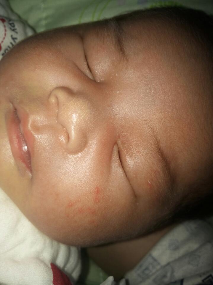 我家大宝脸上起小红色的疙瘩是怎么回事啊?有两天了,身体其他部位都没有