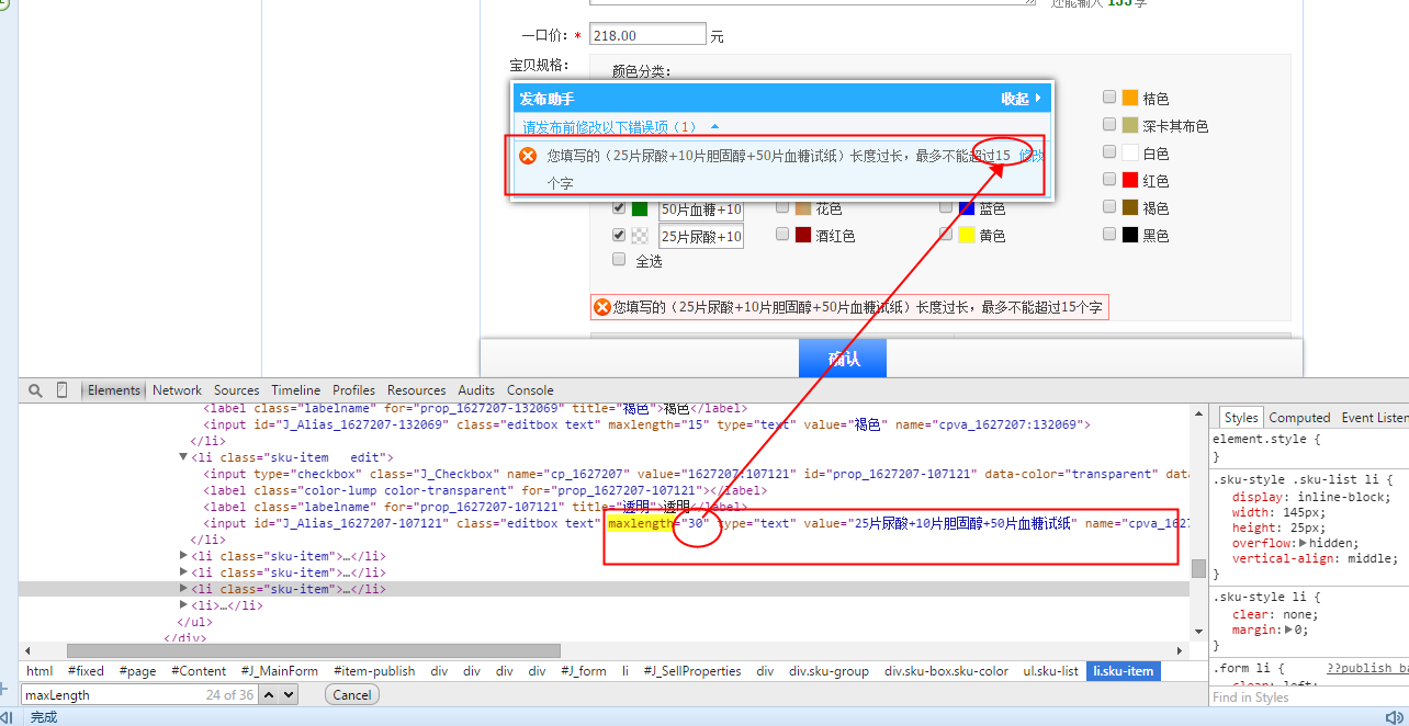 您改这个maxlength没用的,这个错,是淘宝后逝贸台报的。 现在淘宝后台宝贝管理采用schema API,会对宝贝属性进行系统级别的控制,无法简单地通过前台修改(实际上不可能突破,因为您总不可能控制淘宝后台) 建议想别的做法吧险斯,比如写成“套餐1”“套餐2”之类的,然后在宝贝描述顶部写上套餐包含内容。 =============== 顺便推荐一下《27A宝贝描述模板》,当然解扬唤逝决不了您的问题,因为27A只能做描述部分。目前有700皇冠300天猫在用,是最专业的宝贝描述工具,没有之一。