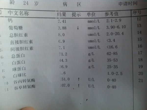 肝功能偏高对人体有什么影响吗?对胎儿有影响吗?我看那个谷草转氨酶107和谷丙转氨酶151偏高 需 要住院治疗吗? 点击展开 匿名用户 2013-11-22 17:19 为您推荐: 其他回答 病情分析: 你好: 健康人的转氨酶水平也有可能暂时超出正常范围如剧烈运动、过于劳累、近期吃过于油腻的食物或酗酒等都可能使转氨酶暂时偏高。 指导意见: 建议清淡饮食,禁烟酒,合理休息。而且你是轻度升高。通常不会有明显的影响的。 匿名用户 2013-11-22 17:23 相关问题 医生问哈 怀孕8个月了,做肝功能检查,谷丙转氨酶107和谷草转氨酶64偏高 对胎儿有影响没 4个月 谷丙转氨酶偏低,谷草转氨酶正常,ASTALT偏高,肝功能… 肝功能检查,谷丙转氨酶ALT:90UL,偏高;谷草转氨酶…