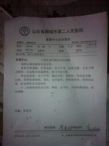 医生:我母亲58岁,20年老胃病了,胃口处有疼痛感饭量也不行,五个月前做了检查(检查结果在下面)