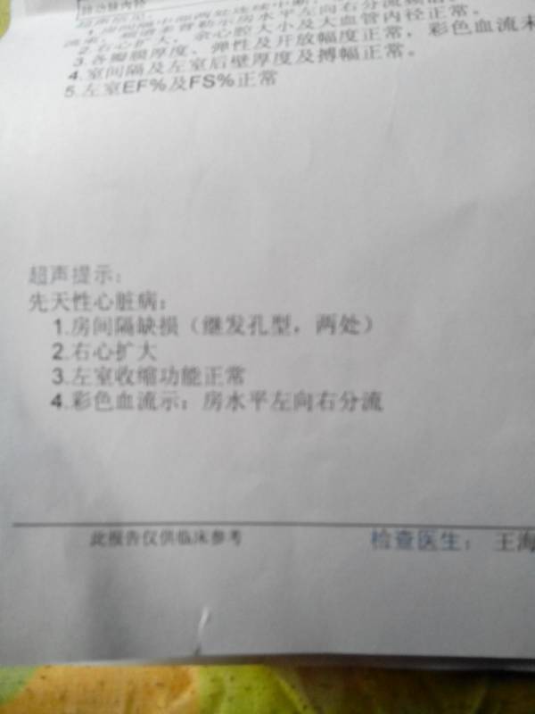 我家宝宝四个月体检心脏有杂音 经超声检查先天性心脏病 房间隔中部两处连续中断,缺损大小分别为一5