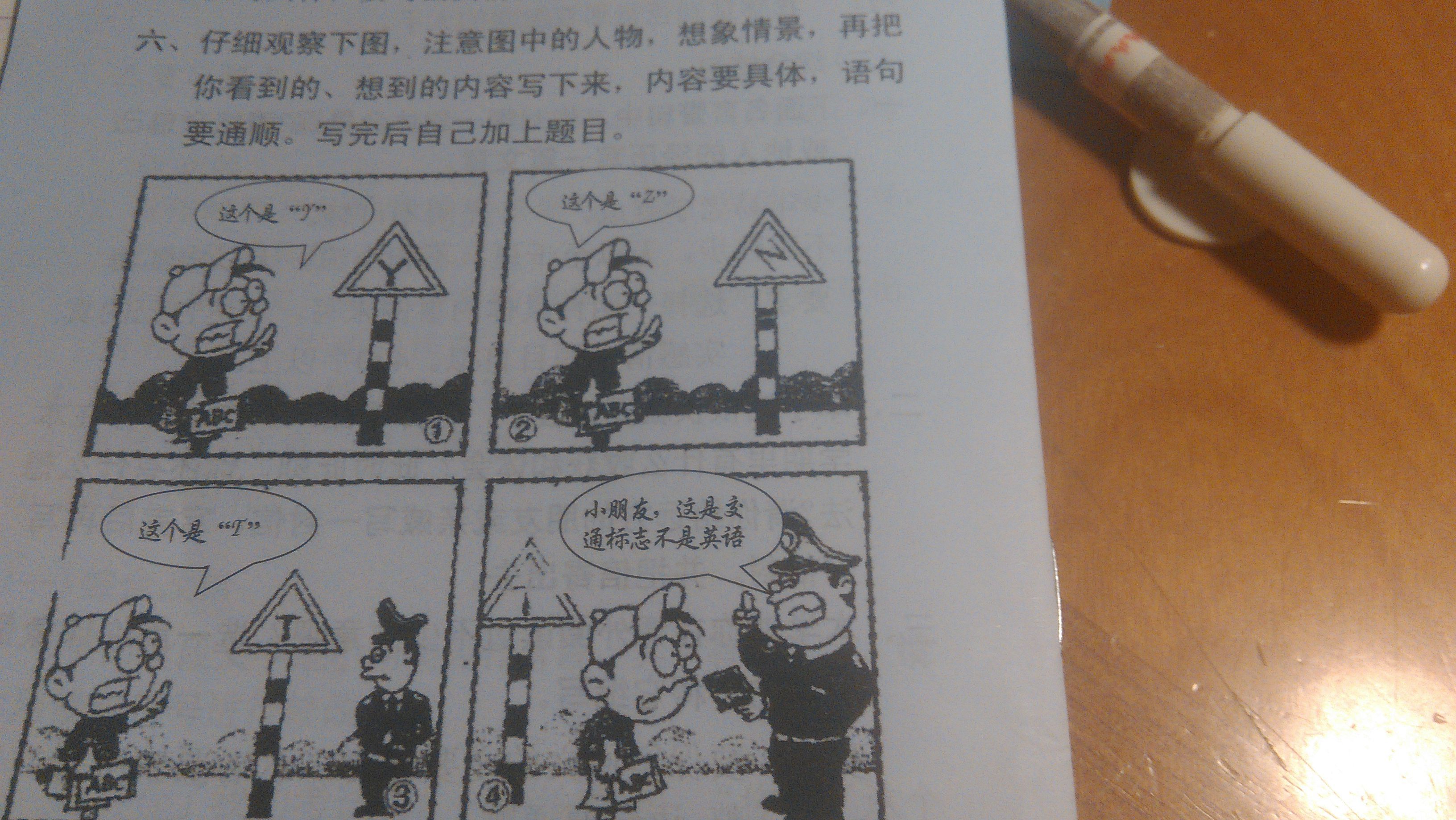 故事大概内容是,一个小男孩把交通标志当成字母了,警察告诉他不是字母,是交通标志