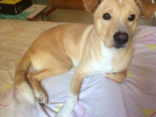 这是只很可爱的狗,它是由金毛和土狗拿出来的串串