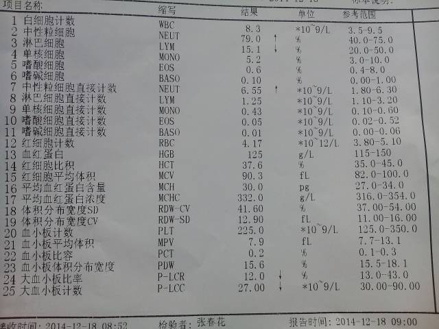 今天查的血细胞分析(五分类)医生说正常大家帮我看看 今天查的血细胞分析(五分类)医生说正常大家帮我看看 点击展开 宝宝们要健康 2014-12-18 15:46 为您推荐: 其他回答 祝宝妈妈好孕% xx782450140 2014-12-18 16:24 分析该血常规,中性粒比偏高,常提示近期感冒、感染等情况,如果没有不适,可以定期复查,若存在感染情况,需积极诊治。 lili0681 2014-12-18 16:14 没事的,多吃点 ——想你、分分秒秒老公 2014-12-18 16:07 。。。。。 1476970049 2014-12-18 15:59 后面有参考范围,有的偏高有的偏低,差一点点没事的 ╰ゞ/xin偲乄 2014-12-18 15:56 加载更多 相关问题 亲们…有会看B超单子的么?这是我今天查的B超…烂医生给我分析得不清不楚…我月经不正常…所以说我连自 人流术后13天了,今天去复查医生说还有积血,是什么原因引起的啊!妇科医生帮我看看我应该要注意些什么 今天去建卡照B超说我胎盘位置太下要随时观察,这是不好吗?会不会很严重呢?有医生帮我看看吗?