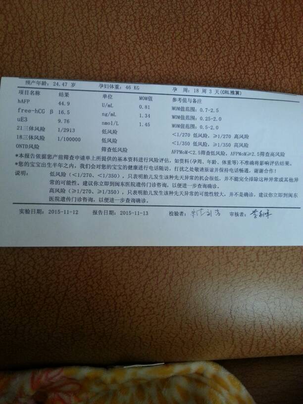 血清学产前筛查报告!请帮我看看这个正常吗? 点击展开 匿名用户 2015-11-20 09:55 满意回答 上述看唐氏筛查综合征挎近殖都是低风险,这个缠辨问题并不大,平时注意休息,定期产检导蛇就可以了 cn#BVVkLpuGGL 2015-11-20 10:24 宝宝知道提示您:回答为网友贡献,仅供参考。 相关问题 产前筛查报告单,请专家们帮我看看啊!!!!!!!!!!!!!!! 血清学产前筛查报告单,我不会看,请帮我看看谢谢 请帮我看看我的血清学产前筛查报告单,有什么问题?